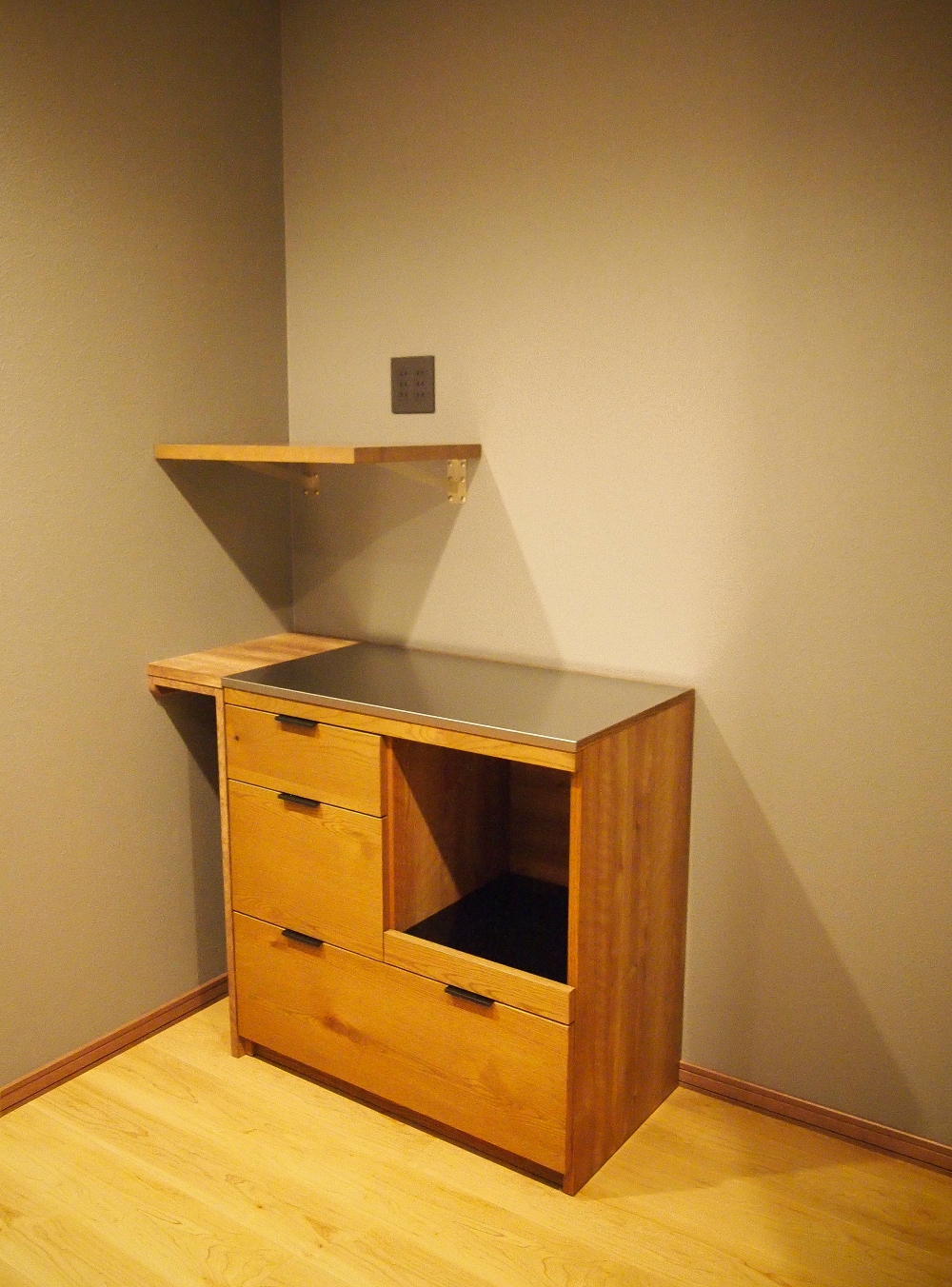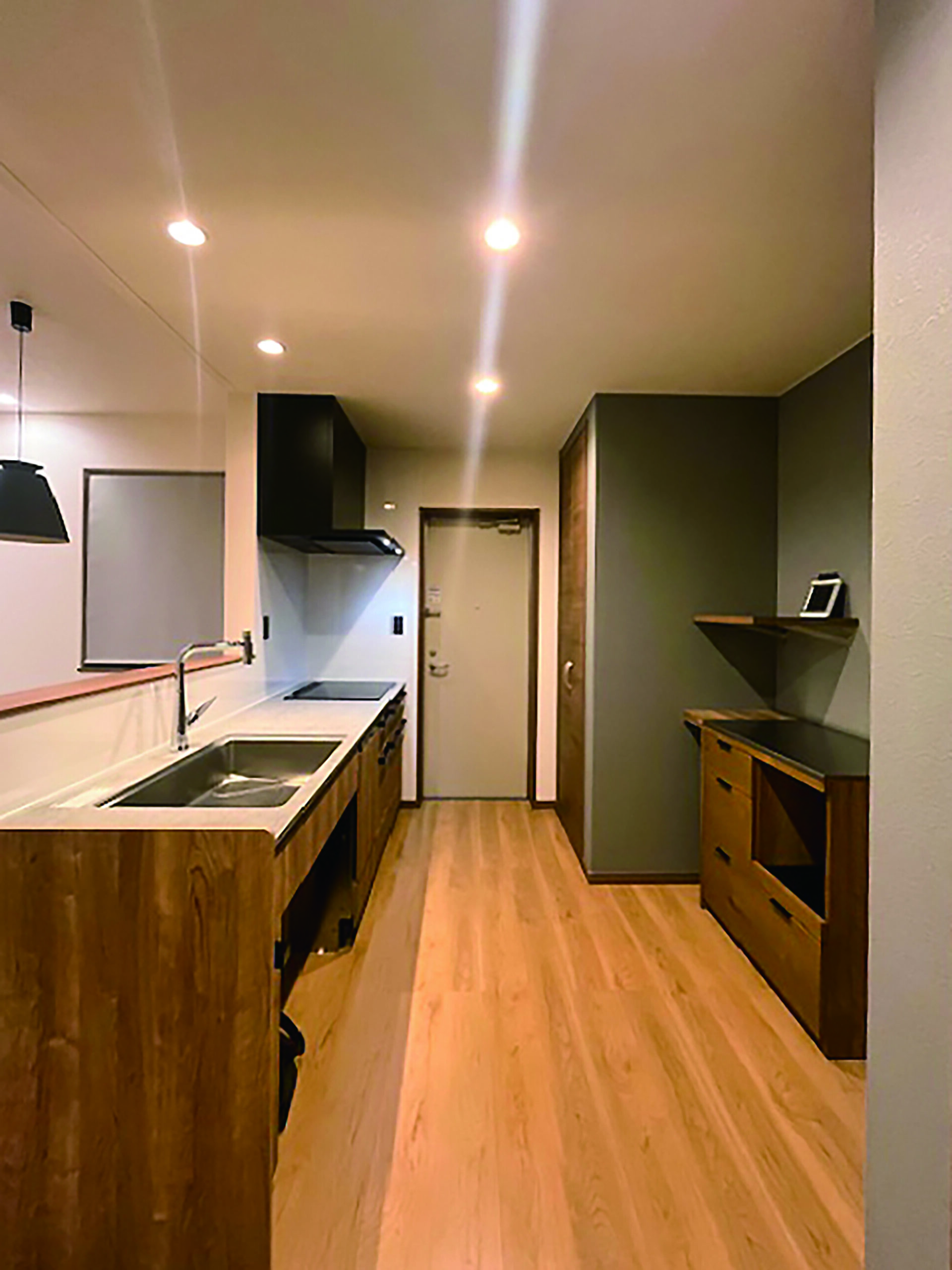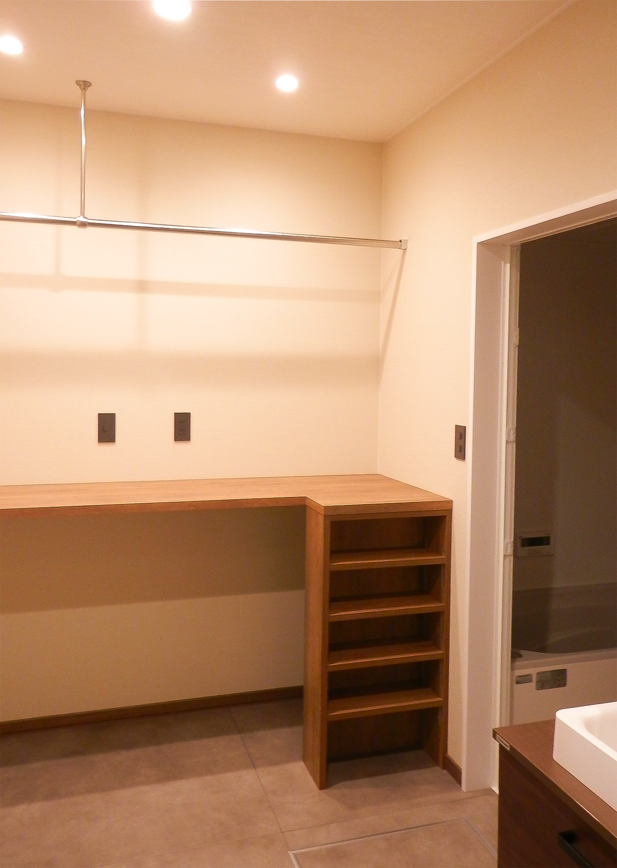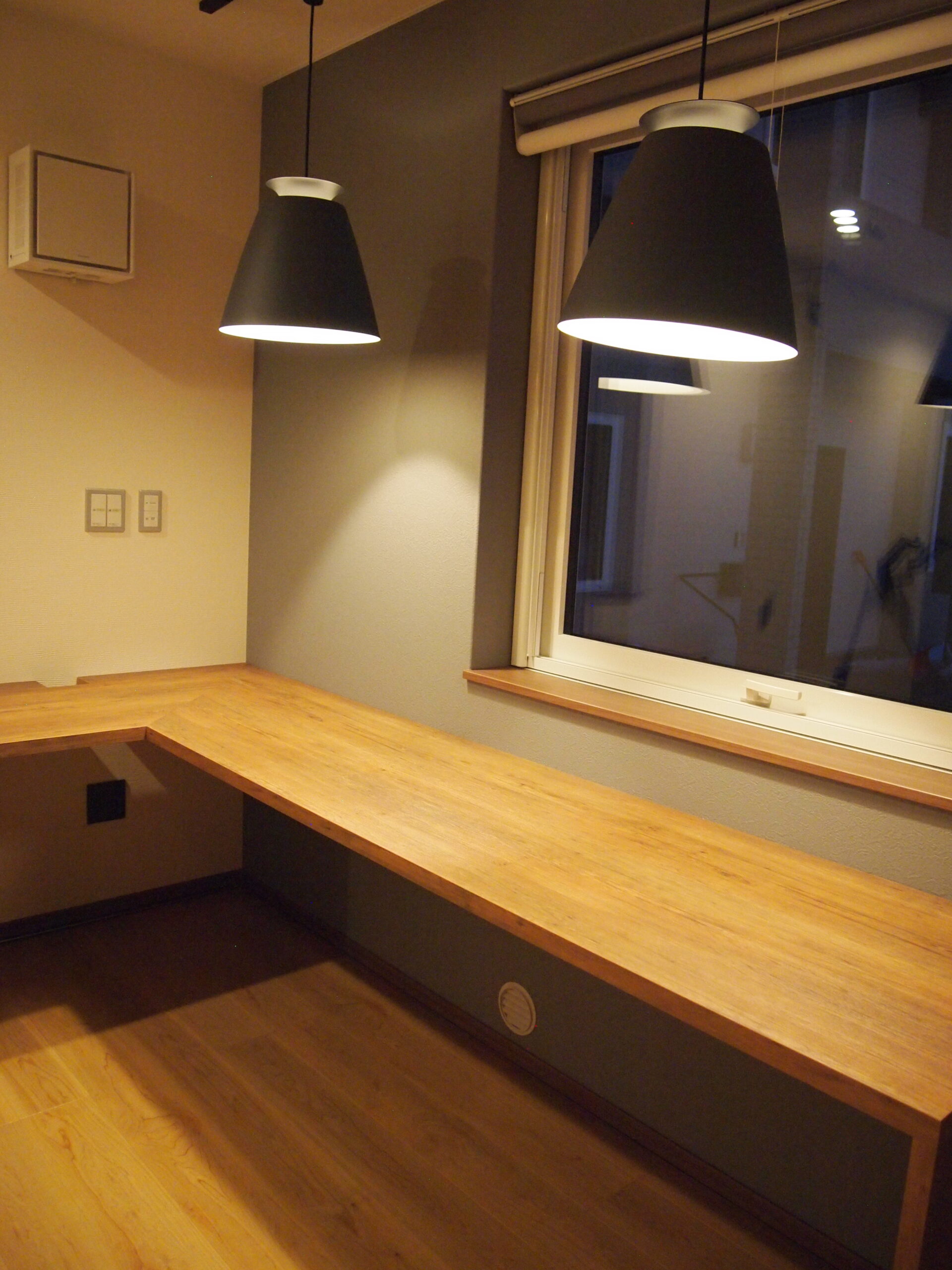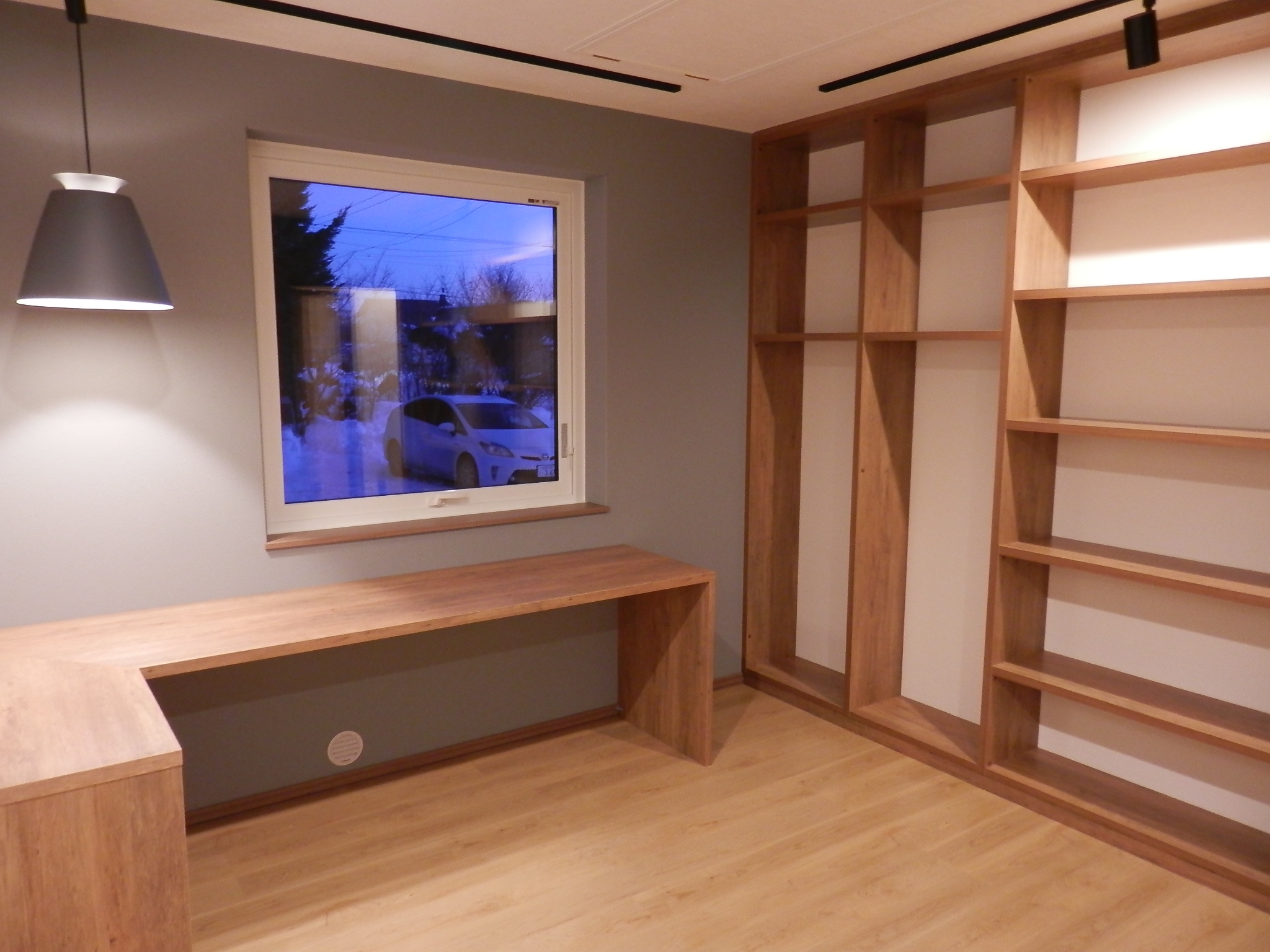 造作棚とL字カウンターを備えた、収納力抜群のワーキングルームは、